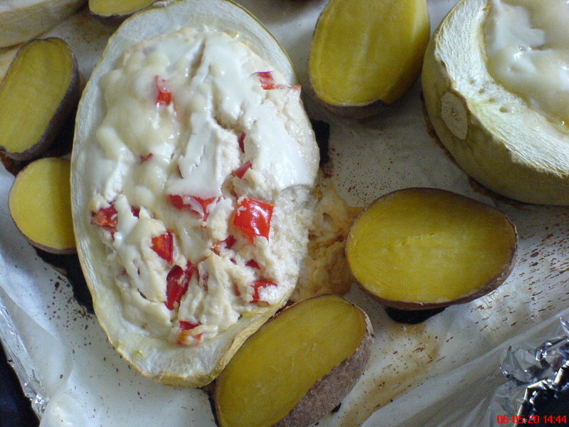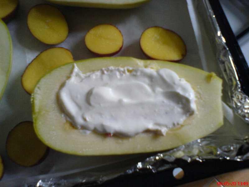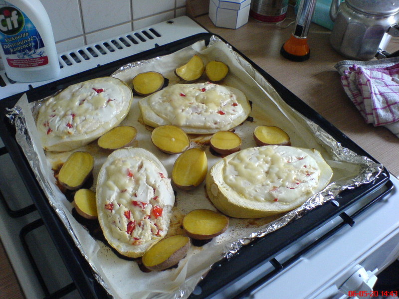 Az a halványzöld, zsenge tök, azt hiszem, spárgatöknek hívják, de elég egyértelműen beazonosítható. ha ez megvan, megmossuk, kemény végét levágjuk, félbevágjuk, belsejét kikanallazuk. igény szerint magok hagyhatók benne (szerintem nem rossz, teljesen puhák). ha ez megvan, kicsit megsózzuk, és belehalmozzuk a tölteléket, ami lehet: